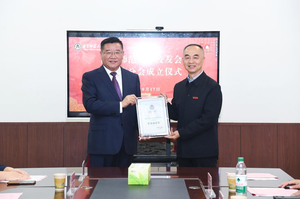 在热烈的掌声中,与会领导嘉宾为校友分会理事会成员颁发聘书并合影留念。