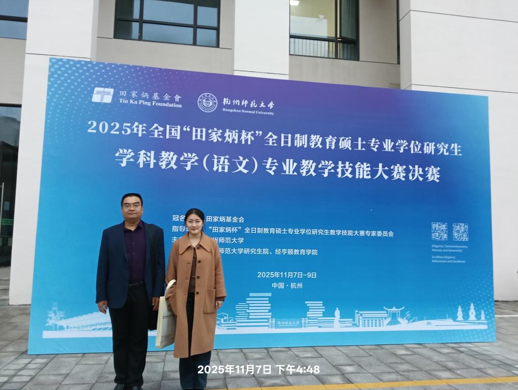 11月7日至9日,2025年全国“田家炳杯”全日制教育硕士学科教学(语文)专业教学技能大赛决赛在杭州师范大学隆重举行。我院2024级学科教学(语文)研究生李晓曼在指导教师朱献贞、周春波带队下,参加了本次竞赛,并荣获大赛三等奖。